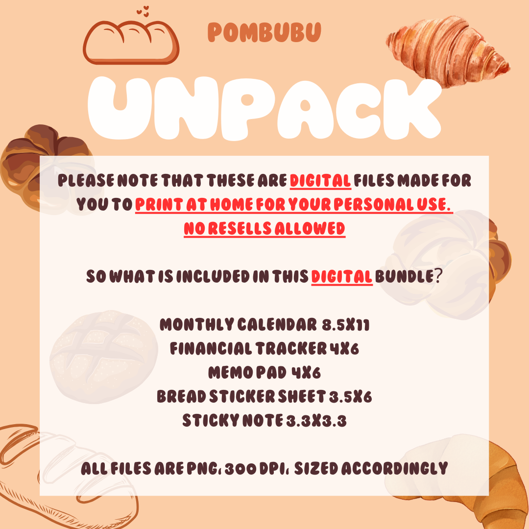 Bake your planning routine extra fresh with this playful Bread Theme DIGITAL Bundle! Perfect for bread lovers, it includes a monthly calendar, memo pad, financial planner, sticky notes, and adorable bread stickers—all ready to print at home. Mix and match your favorite slices to keep your days organized and tasty. No reselling allowed, just endless freshly baked planning fun whenever you want!