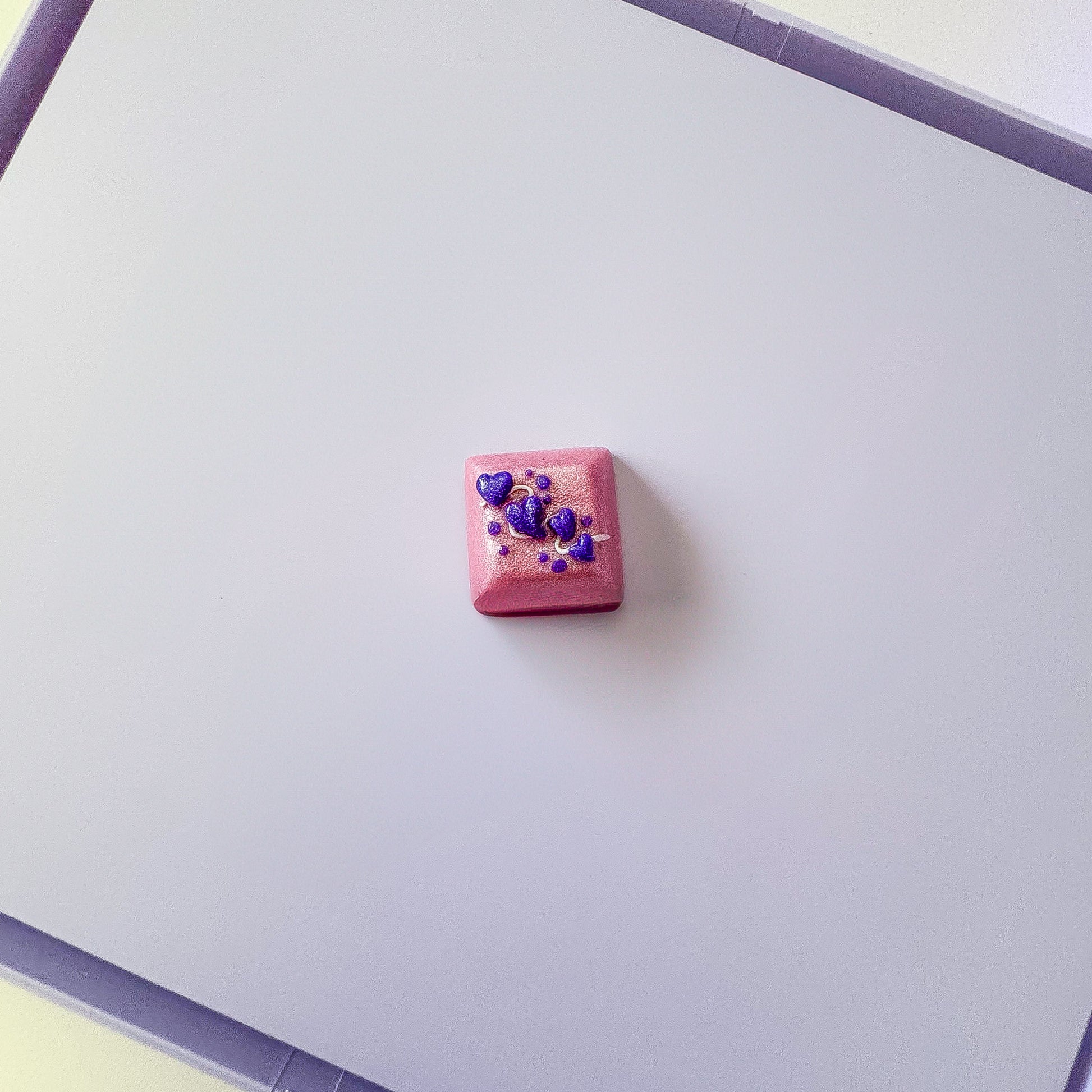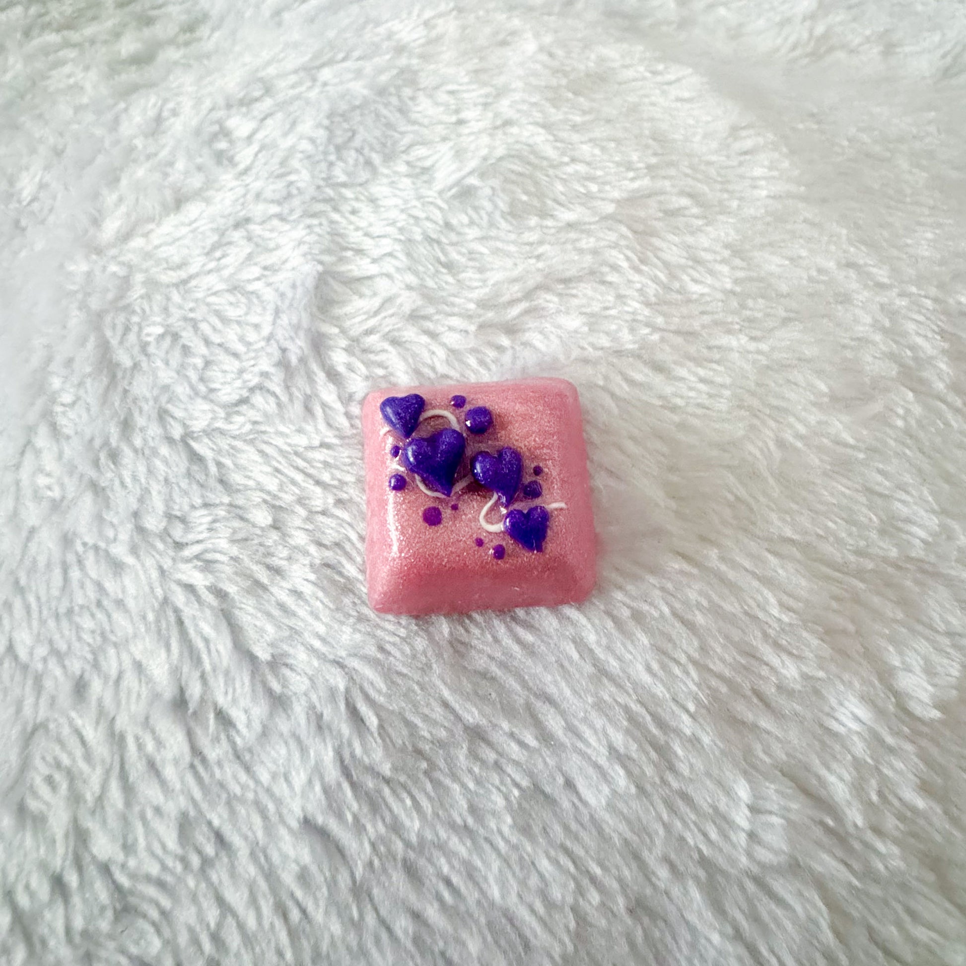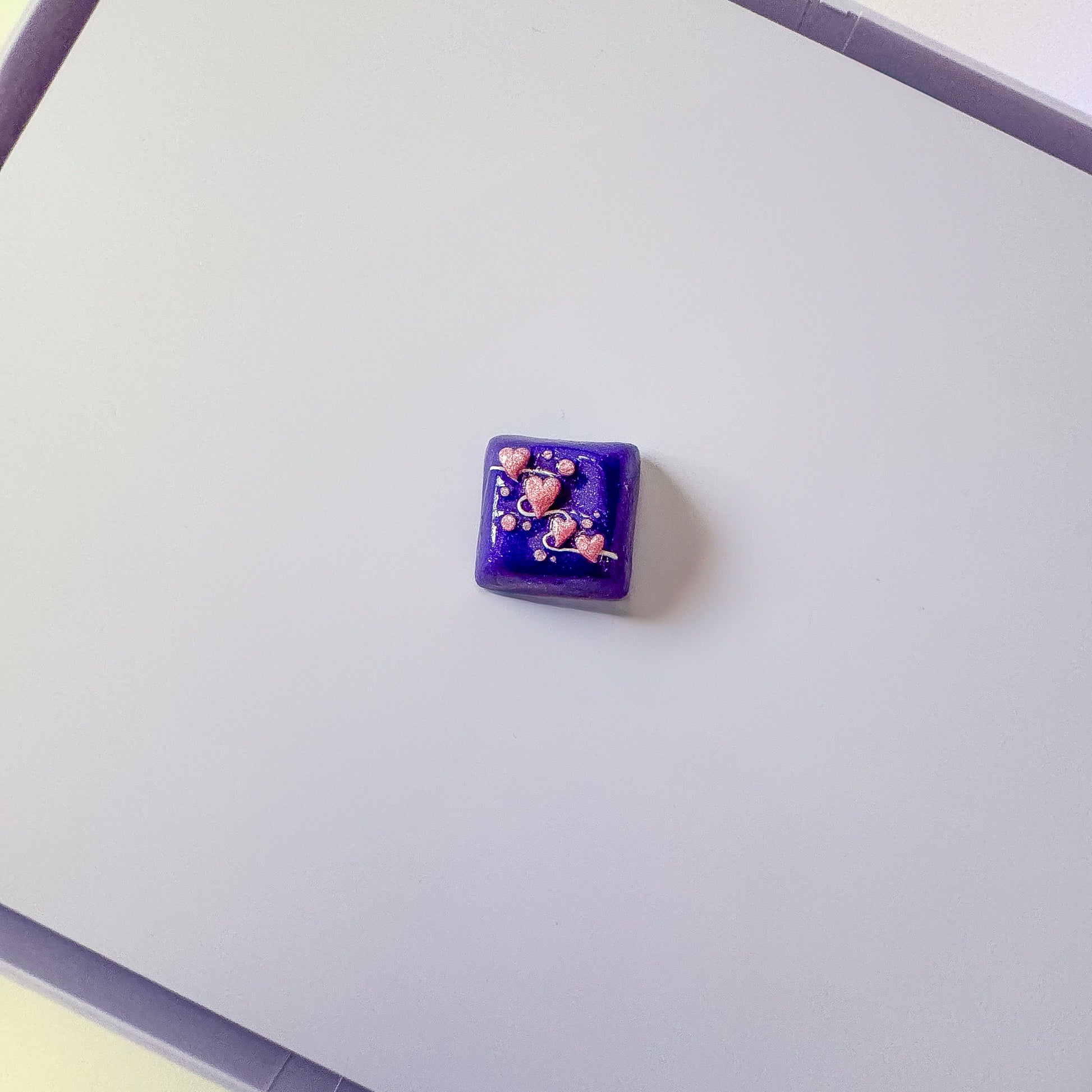 unlock the love in your typing with the heart strings artisan keycap. handcrafted and protected with resin, this pink, purple, and white keycap features a charming heart string design and a touch of sparkly glitter. express your unique style with your keyboard. receive a free mini matching sticker sheet with a purchase of your keycap