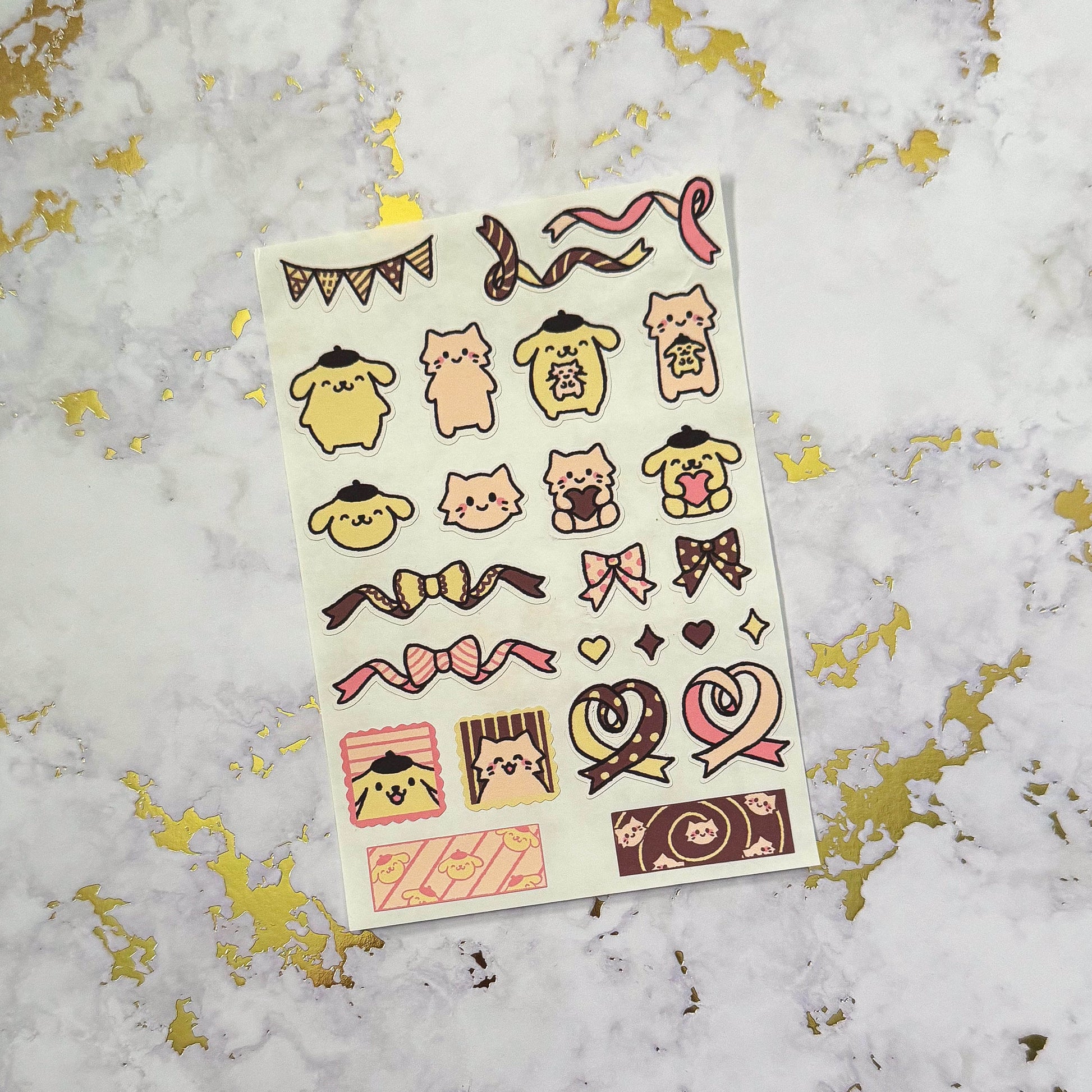 show off your obsession with sanrio characters with these cute and pastel fan art stickers. featuring pompompurin, my melody, keroppi, cinnamoroll, hello kitty and add some bubbly fun to your planner or decor with bubu, eira, mimi, and arn~