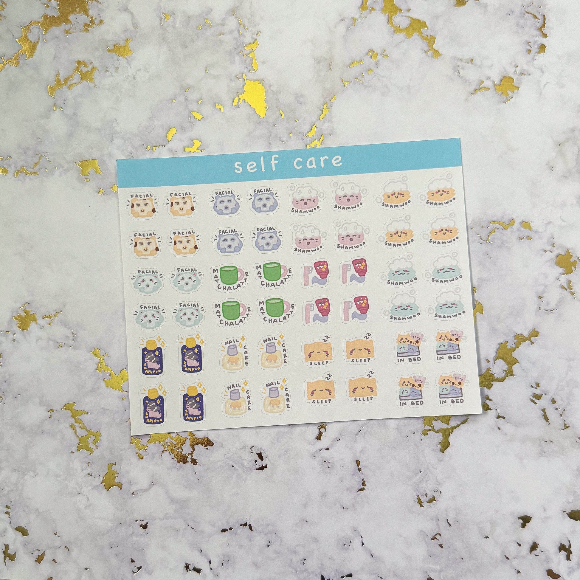 indulge in self care with our quirky self care planner stickers. the sticker sheet features a different way to pamper yourself - from taking a relaxing shower to staying in bed and catching up on some much-needed rest. with these stickers, self-care has never been easier (or cuter)!