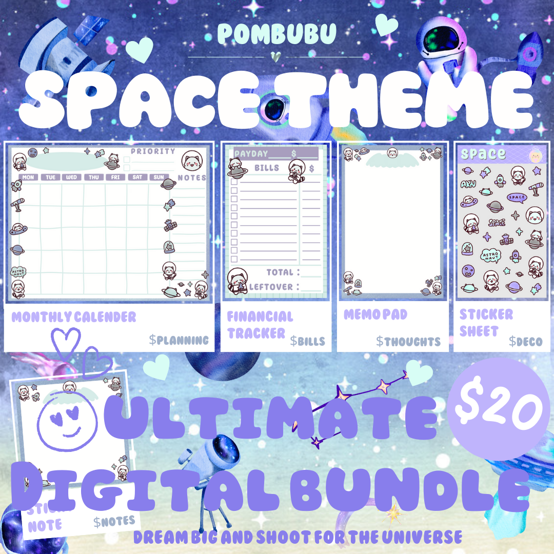 Blast off into cosmic organization with the Space Theme DIGITAL Bundle! Designed for space lovers fueled by curiosity and dreams of universe domination, this playful set helps you chart your plans among the stars. Perfect for digital planning enthusiasts, it’s for personal use only—no reselling allowed. Get ready to conquer your goals with a little interstellar fun!